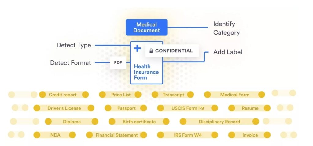 - Classificação de dados não estruturados usando técnicas baseadas em aprendizado de máquina em categorias diversificadas (Vendas, Médicos, RH, etc), tipos (formulário de consentimento médico, imposto de renda, holerite, etc) em vários formatos. Além disso, as organizações podem definir seus próprios esquemas usando perfis de conteúdo baseados em regras. Uma biblioteca de perfis integrados, como PCI, PII, PHI, GLBA e FERPA, ajuda os clientes a iniciarem imediatamente.